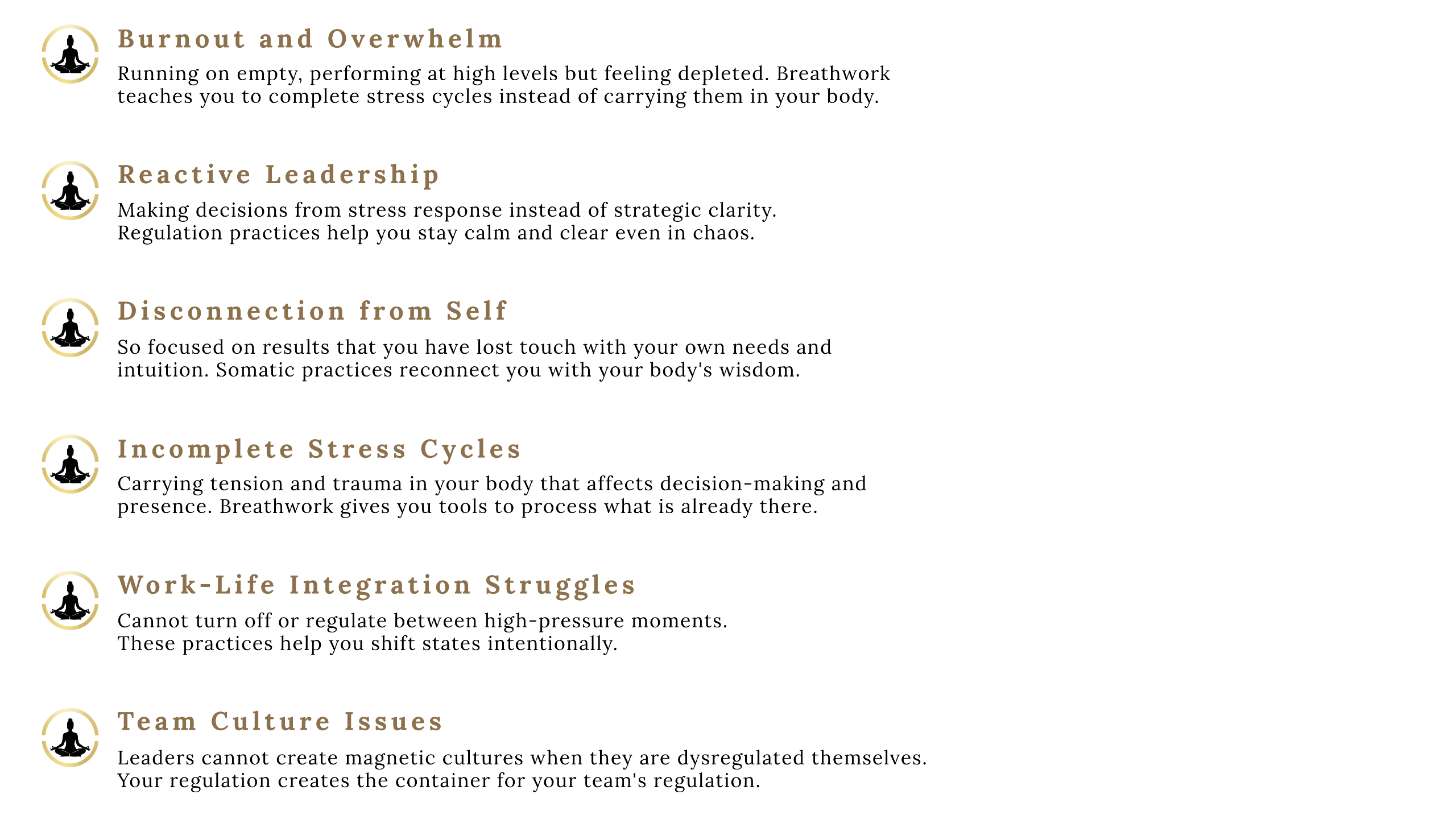 I got certified in breathwork and somatics because I saw the gap. High-level leaders have every strategy and framework at their fingertips, but no one is teaching them how to regulate their nervous systems under pressure. You cannot think your way out of burnout. You cannot strategize your way into embodied presence.